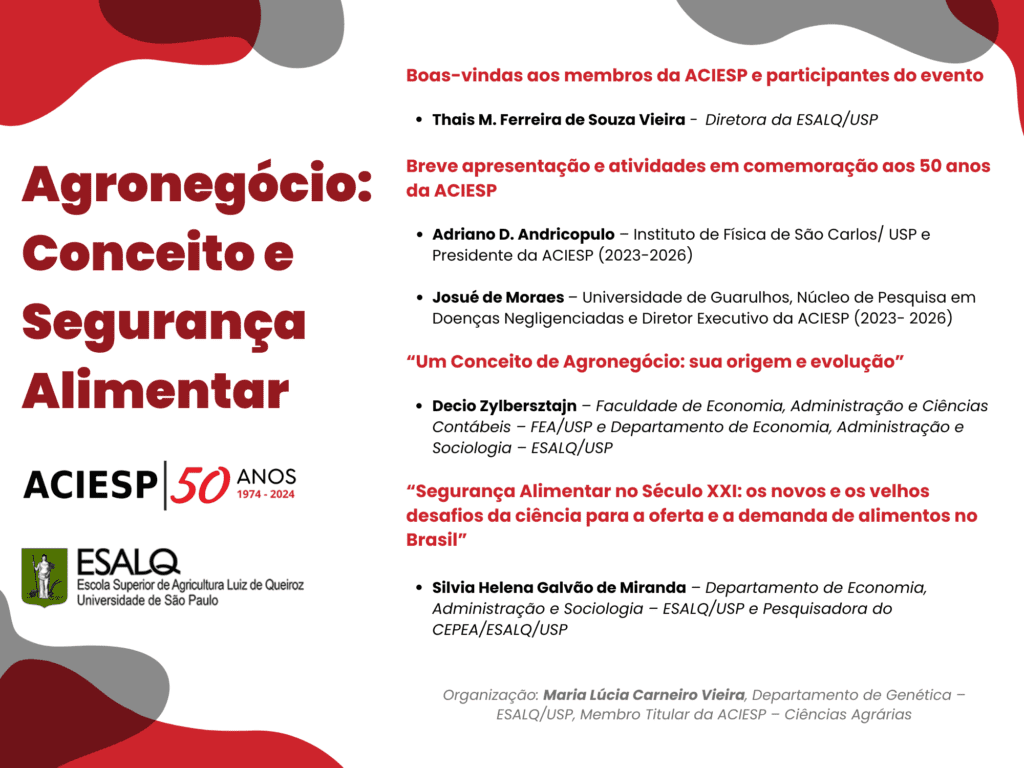 Como parte das celebrações dos 50 anos da ACIESP, no dia 27 de maio acontecerá o evento “Agronegócio: Conceito e Segurança Alimentar” na Escola Superior de Agricultura Luiz de Queiroz da Universidade de São Paulo (ESALQ-USP), em Piracicaba. O encontro, idealizado por Maria Lúcia Carneiro Vieira, membro do conselho Diretor da ACIESP, é uma iniciativa conjunta das duas instituições.