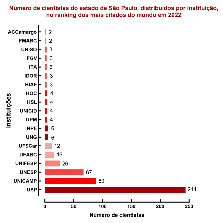 * Número de Pesquisadores de São Paulo em Destaque no Estudo Internacional. Os dados, distribuídos por instituição, foram obtidos do estudo divulgado pela editora Elsevier em colaboração com a Universidade de Stanford (EUA). O gráfico apresenta as instituições que contaram com pelo menos dois cientistas mencionados no estudo. Universidade de São Paulo (USP), Universidade Estadual de Campinas (UNICAMP), Universidade Estadual Paulista (UNESP), Universidade Federal de São Paulo (UNIFESP), Universidade Federal do ABC (UFABC) Universidade Federal de São Carlos (UFSCar), Universidade Guarulhos (UNG), Instituto Nacional de Pesquisas Espaciais (INPE), Universidade Presbiteriana Mackenzie (UPM), Universidade Cidade de São Paulo (UNICID), Hospital Sírio-Libanês (HSL) e o Hospital Alemão Oswaldo Cruz (HOC), Hospital Israelita Albert Einstein (HIAE), Instituto D’Or de Pesquisa e Ensino (IDOR), Instituto Tecnológico de Aeronáutica (ITA), Fundação Getúlio Vargas (FGV), Universidade de Sorocaba (UNISO), Faculdade de Medicina do ABC (FMABC), A.C.Camargo Cancer Center (ACCamargo).
